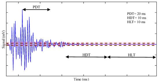To discriminate different acoustic events, we must select three time-parameters, PDT, HDT, and HLT, [50,51,52], represented in Figure 4. Their choice is critical for the correct identification of hits.