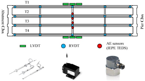 The monitoring system designed for the load test consists of 119 sensors divided into eight types: wire displacement sensors (RVDT), deformation sensors (strain gauges), crack-opening sensors (LVDT), electronic level, temperature sensors (RTD), inclinometers, accelerometers, and AE sensors. Furthermore, we monitored air temperature, air humidity, and wind speed. Details about the SHM system installed on the viaduct are in [56] (in Italian).
