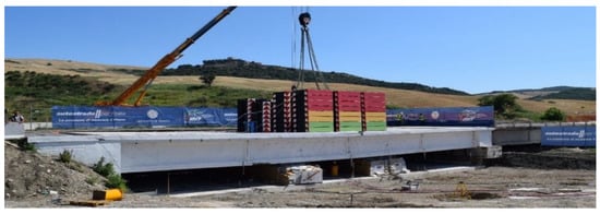 The load-test protocol consists of five loading and unloading phases with a progressive number of steel ballast weights with a size of 2.35 × 1.84 × 0.45 m and a weight of 100 kN each. They are placed in the middle of the span C3sx in layers of 12 ballast each. The load unit is 2400 kN: two layers of ballast, which produces a bending moment in the girders’ middle cross-section of 4200 kNm, corresponding to the load effect resulting from the design traffic load [54]. Figure 7 illustrates the five loading phases, identified with codes P1 (1200 kN), P2 (2400 kN), P3 (4800 kN), P4 (7200 kN), and P5 (bridge’s ultimate capacity). Figure 8 shows a picture of the bridge in phase 5, loaded with 93 ballast—9300 kN. Details about the load-test protocol are in [56] (in Italian).