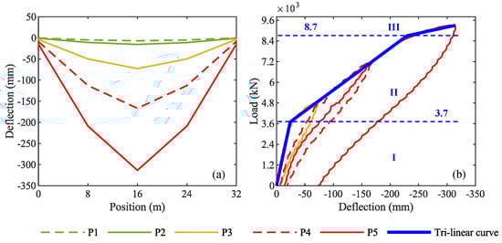 (a) Vertical displacements along girder T1 in the five loading phases; (b) load-deflection curve of girder T1 and its trilinear idealized flexural response.