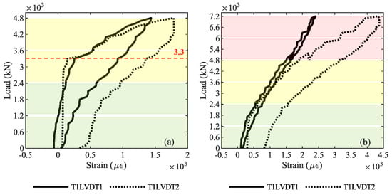 Regarding the cracks opening, Figure 10 shows the longitudinal strain recorded by LVDT sensors at the bottom of the middle cross-section of girder T1: Figure 10a is about the loading phase P3—4800 kN, while Figure 10b is about the loading phase P4—7200 kN. In Figure 10a, a change from stage I—elastic—and state II—cracked is visible, corresponding to a load of 3300 kN. In contrast, Figure 10b shows a softer change in the behavior, confirming the cracked condition of the girder from the beginning of P4. The colors green, yellow, and red in the background of graphs represent the layers of steel ballast weights loaded on the viaduct: two green layers for 2400 kN, two additional yellow layers for 4800 kN, and two additional red layers for 7200 kN (see Figure 7 for the load-test protocol).