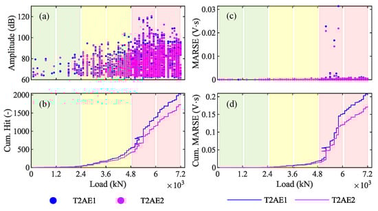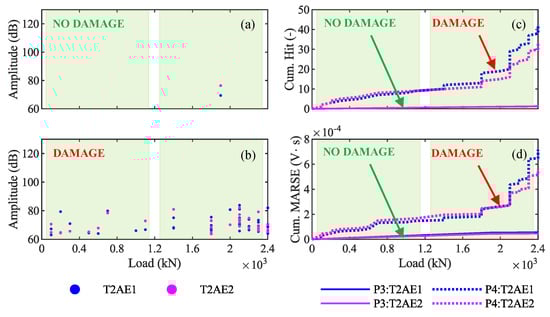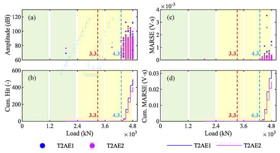 (ii) AE also allow clear identification of the opening of the first crack, as this is typically accompanied by the first-time emission of a high-intensity signal, followed by several more as the cracks propagate. The opening of the first crack is easily detected by plotting the amplitude or the cumulative number of hits against the load (see Figure 13a,b). The first-crack also corresponds to the first of a series of AE with a high MARSE in the MARSE graph and to a sharp change in the slope in the cumulative MARSE graph (see Figure 13c,d).