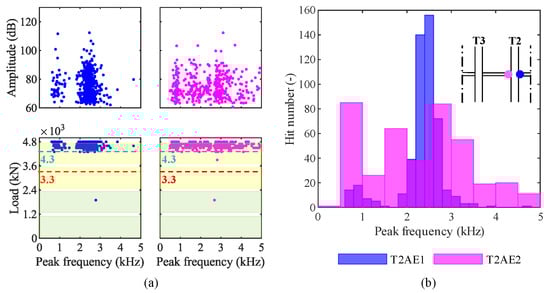 To discriminate different types of damage, such as concrete cracks and failure of steel wires, we analyzed the AE in the frequency domain. We aimed to investigate the presence of clusters in amplitude—peak-frequency graphs and load—peak-frequency graphs. Such clusters may represent different sources of the elastic waves [47]. Figure 14a shows these graphs for both the sensors installed on the girder T2. Two clusters are clearly visible in data from sensor T2AE1, while data are more scattered from sensor T2AE2. We reported the distributions of peak-frequencies from AE recorded by both sensors in a histogram represented by Figure 14b.