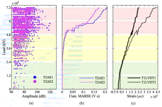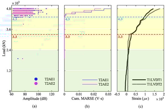 Finally, we compared the results from the AE acquired on the girder T2 with the results from the crack-opening sensors LVDT installed on the girder T1. Figure 15a shows the hit amplitudes recorded during the loading phase P3, Figure 15b shows the cumulative MARSE, and Figure 15c shows the strain at the bottom of the girder T1. The blue dashed line at 4300 kN represents the value of the load when we recorded the AE generated by the opening of the first crack in the girder T2; after that, AE increase considerably. In contrast, the red dashed line represents the first-crack load (3300 kN) identified by LVDT, as already explained in Section 4.1.