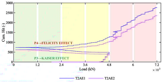 The difference between P3 and P4 in terms of the cumulative number of hits is consistent with the Kaiser and the Felicity effects, which are visible in Figure 20. Note that Figure 20 is the union of the cumulative number of hits during P3 (Figure 13b), during P4 (Figure 16b), and during the unloading phase between P3 and P4. During the loading phases P3, it is possible to observe the Kaiser effect [53] since any permanent damages have never occurred within the girder before P3: as the load increases from 0 kN to 4800 kN, no AE are generated until the exceedance of the first-crack load. In contrast, during the loading phase P4, it is possible to observe the Felicity effect [53] since some permanent damages have occurred in the previous phase: as the load increases from 0 kN to 7200 kN, some AE are generated starting from 1200 kN, before the previous maximum load (4800 kN) is exceeded. This difference in the AE recorded during phases P3 and P4 for low values of the load points out a difference in the structural behavior and can discriminate the presence of pre-existent cracks.