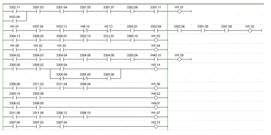 Our main goal is to improve the flexibility of the production lines, i.e., the ability of the line to automatically adapt itself to evolving requirements (a larger variety of parts to produce, for example). However, European manufacturing companies usually rely on the CIM model. Consequently, each production system has its own logic that is implemented in a PLC. PLC programs are developed in a rigid manner, and they are not meant to evolve in order to adapt to a changing environment. Any modification to the code requires human intervention. This old-fashioned and rigid automation model is a hurdle to the improvement of the production lines’ flexibility. As an example, Figure 1 is an excerpt from a PLC program of a real production line (the whole program contains over 6000 instructions, each line is an instruction). Modifying this program requires having a perfect understanding of the process and the program, since the sequence of instructions is important and it should not be randomly modified (it could impact the process). Each modification implies a large testing process on the production line.
