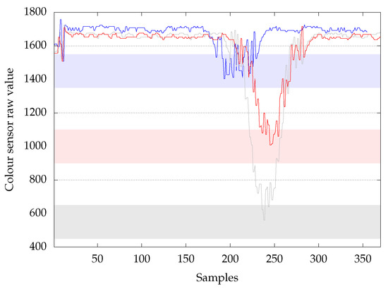 Additionally, we could observe the colour sensor limitations, when considering that the range of values that it can return is quite narrow (0–2000 mV), it may not be possible to add more colours, because the TS corresponding to these colours will overlap (see when there is only one TS of each colour for the six colours in Figure 6). Note that, nonetheless, it also occurs in our experiments, in particular with blue and green colours. That is the reason why (i) it is really difficult to manage in a static program (where thresholds need to be defined) and (ii) the ML-based program was experimented.