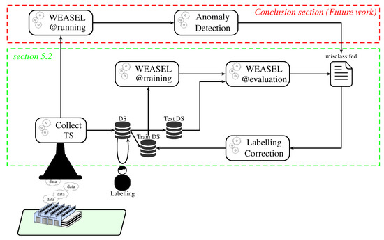 Before being able to use WEASEL@running for classifying new parts (and, therefore, sorting them out), the use of ML requires collecting time series as datasets for training and evaluating our models (cf. Figure 4). Although the data collection, the training, and the evaluation processes can be automated, a human intervention is still needed to label our data (i.e., assigning the right class/colour at each time series). In the same way, and according to the accuracy of our model, misclassifications of the test TS can be re-labelled for re-training the model and improving it.