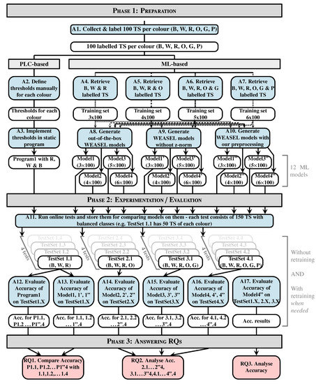 Figure 5 presents the methodology defined for conducting our experiments and evaluations. Additionally, all of our experiments are conducted by logging each TS and the corresponding class that is predicted by WEASEL on the controller, in order to save the testing data sets for offline replays, for example. In addition, parts have always been following a predetermined sequence, so as to know the ground truth and to be able to evaluate the results.