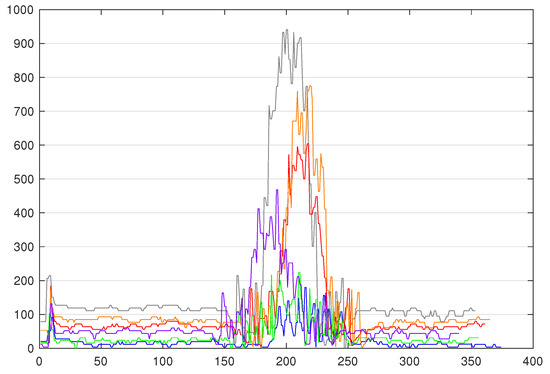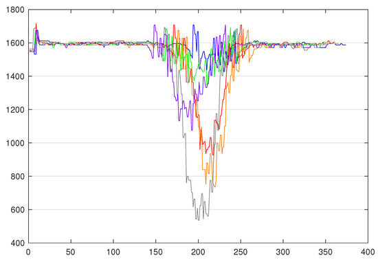 - Four models with our preprocessing (cf. activity A10 in Figure 5): For the purpose of concluding on the importance of a suitable preprocessing method, four models were trained with our preprocessing method. Let us first present the preprocessing method that we propose. This method is for ensuring the same reference for the TS inside of the same class. Because the means of the TS inside of the same class are the same, but they are different between each class, we chose the mean as the reference for the TS. Our preprocessing is as follows: (i) for each TS, we compute the mean value of the whole series, and subtract this mean value from each original element of the time series; (ii) for each modified element, we compute its absolute value, and replace the element by this absolute value (this reduces the brutal changes in the TS caused e.g., by the inaccuracy of the sensor measurement or any environmental change). Using this method, we not only ensure that TS from the same class have the same reference (their means), but we preserve the amplitude difference in the pattern and we also deliberately shift TS from different classes (as depicted in Figure 7 between y = 0 and y = 200, as opposed to y = 1600 in Figure 6), and the reference is also becoming a characteristic. We implemented this method in WEASEL’s code and trained the following models. Model1” is trained on the same training set as Model1 and Model1’ (3 × 100 TS, three colours), Model2” on the same training set as Model2 and Model2’ (4 × 100 TS, four colours), Model3” on the same training set as Model3’ and Model3 (5 × 100 TS, five colours), and Model4” on the same training set as Model4’ and Model4 (6 × 100 TS, six colours). The elapsed times in the training process for Model1”, Model2”, Model3”, and Model4” are, respectively, 17.6 s, 31.0 s, 157.6 s, and 243.4 s.