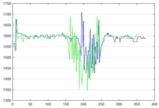 The next experiment is the evaluation of Model3, Model3’, and Model3” (cf. A15 in Figure 5) on TestSet3.1 to TestSet3.4 (5 colours). The accuracies are presented in Table 4. With these results, we can see that neither the z-normalisation (Model3) nor no normalisation (Model3’) are optimal. This is due to the fact that some TS of different classes have the same amplitude, e.g., blue and green TS, as shown in Figure 8. However, our preprocessing method, since it adds an offset between TS of different classes, allows for WEASEL to classify TS with a better accuracy.