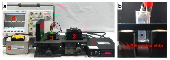 Photos of (a) the equipment setup for photocurrent measurement and (b) the detection cell. In (a), 1: laser power controller; 2: 532 nm CW laser; 3: detection cell and the holder; 4: beam dump; 5: current amplifier; 6: oscilloscope. In (b), a b-PM coated chip and a platinum bar are positioned inside a cuvette and then connected to the current amplifier through the black and red wires, respectively. The b-PM chip is prepared with an APPA-aminated ITO glass that is covered with a holed tape, following the procedure described in the Section 2.2. The hole has a diameter of 3 mm, and is made to confine material coating and to ease laser-beam alignment.