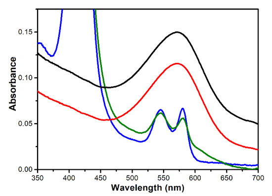 Overlapping absorption spectra of (red) 50 μg/mL b-PM, (black) 50 μg/mL PM, (blue) 100 μg/mL HbA0 and (green) 100 μg/mL HbA1c. The monomeric extinction coefficients of b-PM, PM, HbA0 and HbA1c at 532 nm are calculated to be 49,451, 68,061, 7368 and 9066 cm−1∙M−1, respectively.