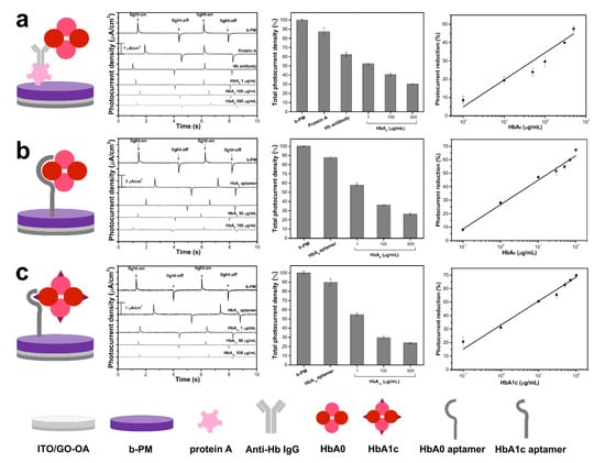 A Hb immunosensor was first devised to determine the feasibility of direct Hb detection using b-PM as a transducer. As shown in the left panel of Figure 3a, the sensing chip was prepared by adsorbing Hb-specific antibodies on a protein A-coated b-PM chip, which was constructed by covalently conjugating protein A on a large, nearly continuous and unidirectional b-PM monolayer that was formed on the ITO electrode using a double-sided planar GO-OA complex linker and a post-deposition washing procedure [24]. The planar complex linker had OA molecules conjugated on both basal planes of a GO sheet, so it was horizontally positioned on an APPA-aminated electrode through the Schiff’s base linkage between the terminal amines of APPA and the aldehydes of oxidized sugars on avidin. The planar complex linker also provides a flat support for subsequent directional attachment of b-PM patches through avidin-biotin affinity adsorption. The post-deposition washing was performed to provide a shear flow to mobilize and segregate stacking b-PM patches to achieve high-coverage b-PM monolayer fabrication, as well as effective subsequent protein A conjugation. The photocurrent responses that are generated from each type of b-PM coated electrode are shown in the left center panel of Figure 3a. All resemble the previously reported signal, which comprises a pair of two transient spikes with opposite polarity [23,24]. The right center panel of Figure 3a shows a gradual reduction in the total photocurrent density for different b-PM chips that are successively coated with protein A, blocking glycine, anti-Hb antibodies and HbA0 on top, which confirms that the material binds during the layer-by-layer coating process. The reduction in the photocurrent for the immunosensor rose with increasing HbA0 coating concentrations (Figure 3a, right panel). This suggests that HbA0 binding affects the photocurrent that is generated by the coated BR molecules and this effect increases with the HbA0 binding amount. The reduction in photocurrent may be due to light absorption, as mentioned previously, and the inhibition of BR helix movement due to captured HbA0 molecules. Therefore, the b-PM coated electrode is confirmed to be a suitable transducer to directly quantify Hb.