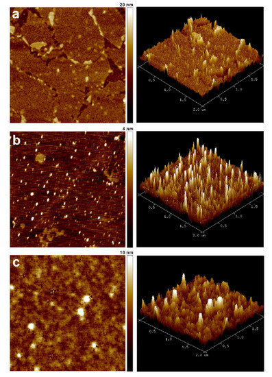 AFM (left) topographic and (right) 3D images of different layer-by-layer fabricated mica. The topmost layer in each image is (a) b-PM, (b) HbA0 aptamer and (c) HbA0: Scan size: 2 μm.