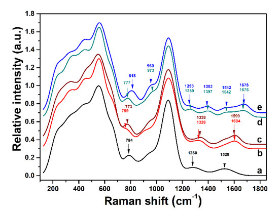 The Raman spectra for the pristine b-PM chip, the HbA0 aptasensor and the HbA0-coated HbA0 aptasensor overlap in Figure 5. The bands are identified by de-convolution, as shown in Figure S3, and then tabulated and assigned in Table S1, according to the results of previous studies. The broad band for the b-PM chip at 784 cm−1 (Figure 5a) is attributed to Trp residues and the weak bands at 1280 and 1528 cm−1 are attributed to the C-C (C=C) stretching and C-C-H in-plane bends of the retina in BR. Further HbA0-aptamer coating is evidenced by the 1326 and 1604 cm−1 bands in the spectrum for the HbA0 aptasensor (Figure 5b), which characterizes DNA bases. After the deposition of HbA0, additional Hb characteristic bands are observed at 973, 1259, 1397, 1542 and 1676 cm−1 (Figure 5d). The difference in the spectra confirms the different compositions of the successively coated materials on the electrode.