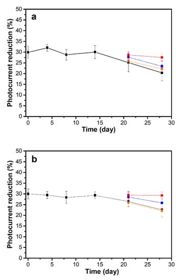 To determine the stability of the HbA0 an HbA1c aptasensors in storage, the physical stability of the b-PM transducer layer is determined. As shown by the AFM in Figure S5, the b-PM coating layer remains firmly attached to the substrate surface after proper storage for 14 and 28 days. The photoelectric activity of the b-PM chip remains almost the same for the first 21 days and decays only slightly at the 28th day (Figure S6a). Similarly, both HbA0 and HbA1c aptasensors remain fully photo-electrically active at the 28th day (Figure S6b,c). However, the detection ability of these two aptasensors toward their respective targets decays noticeably at the 21st day of storage and further at the 28th day, according to the measured decrease in photocurrent in Figure 6 (black points). This decay is attributed to the formation of incorrect secondary conformations of the immobilized aptamers during prolonged low-temperature (4 °C) storage. To restore the target binding affinity for these misfolded aptamers, a mild refolding process was performed before target binding for aptasensors that were stored for 21 and 28 days. The stored cool aptasensors were first denatured at 45 °C for 10 to 30 min and then refolded at room temperature for another 30 min. Higher denaturation temperatures were not used for this study due to possible deterioration of the layer-by-layer structure and the photoelectric activity of the aptasensors. The results that are shown in Figure 6 (orange, blue and red points) show that both aptasensors gradually recover their target binding ability as the heating time increases. If a 30 min thermal denaturation is employed, for the HbA0 aptasensors that are stored for 21 and 28 days, the reduction in the photocurrent with 1 μg/mL HbA0 binding is increased to 28.7 ± 1.7% and 27.5 ± 1.7%, respectively, which corresponds to a 95.9 ± 5.7% and 92.0 ± 5.6% recovery of the target binding ability. Using the same refolding process, the respective target binding ability of stored HbA1c aptasensors at the 21st and 28th days is 98.2 ± 5.9% and 97.5 ± 5.5% of that of a freshly prepared sensor. The as-prepared aptasensors have a robust b-PM transducer layer, stable covalent linkages and the structurally reversible aptamers so they are sufficiently stable in storage.