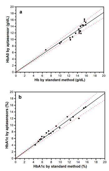 Figure 7b shows that the HbA1c levels that are determined using the proposed aptasensor technique using Equation (1) also correlate well with the levels that are measured using the capillary electrophoresis method (correlation gradient = 0.981 ± 0.001; Pearson correlation coefficient, R = 0.981; inaccuracy = 5.8 ± 4.3%). In comparison with other aptamer-based HbA1c assay methods, the developed photoelectric aptasensors allow direct and label-free detection with the widest HbA1c-level detection range and comparable detection accuracy, sensitivity, specificity, speed and stability (Table S3), so they are suited to clinical applications.