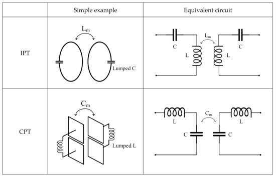 Structural examples of wireless power transfer (WPT) using magnetic coupling, electric coupling, and mixed coupling and their equivalent circuits.