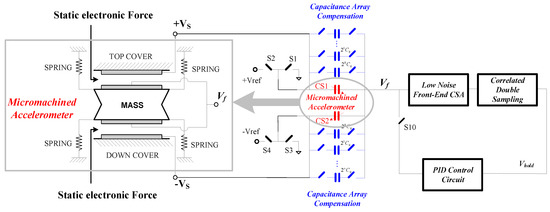 The rest of the paper is organized as follows. In Section 2, the design of the accelerometer sensitive element, capacitance compensation array, front-end charge-sensing circuit, sample and hold circuit, and PID feedback control circuit are introduced. In Section 3, we show a detailed analysis and optimization based on the noise characteristics and sequential control of microaccelerometers with ASIC interface circuit. Finally, Section 4 concludes our study of MEMS accelerometers with high-precision integrated circuit by discussing the test results, which showed that the performance of our microaccelerometer has great advantages in terms of noise floor and power dissipation compared to previously reported works.