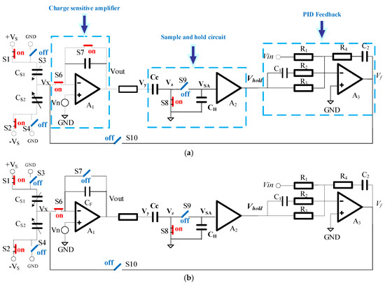 We used this CDS technique to eliminate the low-frequency 1/f noise of the charge amplifier, the charge injection of the analog switch S7, and the error charge caused by clock feedthrough. The output Vy is held in the sampling capacitor CH. At P4 phase, switches S6 and S9 are off and switch S10 is on. The sample and hold voltage Vhold are fed back to the mechanical sensitive element Vx by a PID circuit in order to realize the feedback system of electrostatic force. The capacitance detection circuit is completely isolated from the electrostatic force feedback circuit by switches S6 and S9, so there is no coupling between the driving signal and the detecting signal in the closed-loop interface circuit. The high-order high-pass filter in the continuous time circuit is not needed in our circuit. In this way, the demodulation output error caused by the change of filter parameters is avoided.