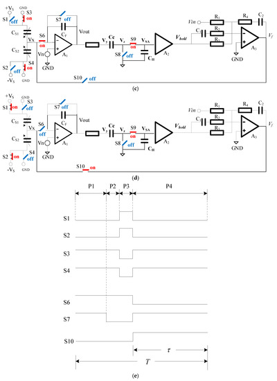 The working sequence of the analog switch is shown in Figure 3a. At P1 phase, the error of the voltage includes offset voltage and low-frequency voltage noise. The amount of charge at Vx can be expressed as follows: