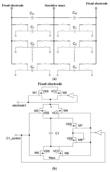 The principle of capacitance compensation array is that the control signal adds the compensation capacitance to the relatively small one between differential capacitances. If the sensitive element does not need compensation, the two plates of the compensation capacitor are connected to the ground potential by the control signal. The capacitance compensation array module is shown in Figure 4b. When electrode 1 is high level, M1 and M2 turn on, and the fixed electrode is connected to point A, as shown in Figure 4b with red marks. At this time, when C1_control is high level, M3, M4, M5, and M6 turn on, and the compensation capacitance C1 is connected between the fixed electrode and the mass block. This can eliminate sensor misalignment by adjusting the compensation capacitance. When C1_control is low level, M7 and M8 turn on, and the plates of capacitance C1 are both connected to the ground. In the integrated capacitance compensation array, the two plates can share C1 to Cn capacitors, as shown in Figure 4a. As long as we adjust the two control signals of electrode 1 and electrode 2, we can decide whether point A is connected to the upper plate or the lower plate of capacitance. The accelerometer sensitive element with vacuum packaged silicon structure used in this study for the design, simulation, and tests is from Colibrys Company (VS9010)(Yverdon-les-Bains, Switzerland). The major parameter indicators in the sensitive element are shown in Table 1.