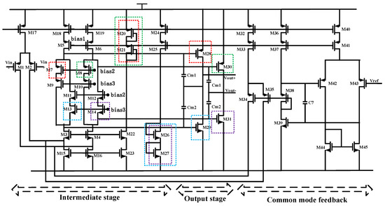 We considered the 1/f noise and KT/C noise in the interface ASIC based on the weak charge signal of microaccelerometers. We used the common-gate M3 and M4 transistors, which were connected to the virtual location, to reduce the substrate bias effect of input-stage transistors in our design. We also used a fully differential folded cascode structure with common-mode feedback in the input-stage circuit. In order to suppress circuit noise and achieve higher gain accuracy, we used the gain booster technique to improve DC gain in the PID feedback and CSA. The circuit and layout have been designed to satisfy the size and symmetry. The circuit diagram of the intermediate stage and the output stage is shown in Figure 8. The intermediate stage adopts folded cascode structure to improve the gain. The output stage adopts class-AB fashion to achieve rail-to-rail output. In order to save power, the class-AB mesh structure is incorporated into the output branch of the intermediate stage. The bias condition of the class-AB stage is determined by four translinear loops, which are marked in color in Figure 8. One of the translinear loop M20, M21, M7 and M28 can be expressed as follows: