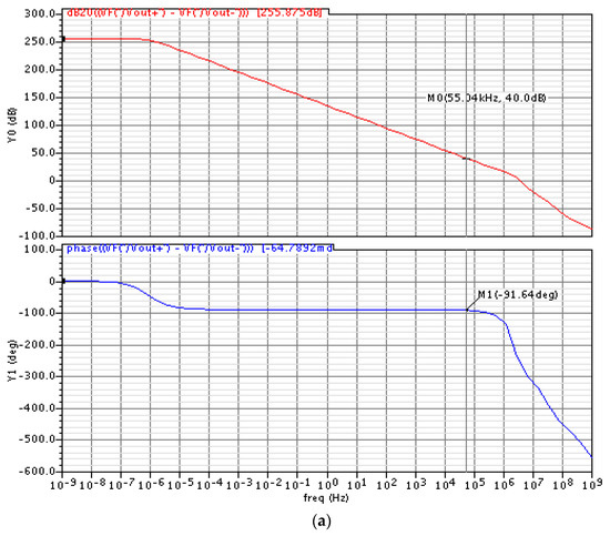 We simulated the amplitude frequency characteristics and noise characteristic of the interface circuit, as shown in Figure 9. The circuit can achieve a DC gain of 256 dB and a bandwidth of 55.34 kHz at 40 dB closed-loop gain. The noise of the interface circuit is about 16.17 nV/Hz1/2. The noise corner frequency is in the order of mHz.