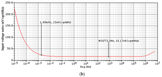 Simulation of the interface circuit: (a) amplitude frequency characteristic simulation in Cadence; (b) noise characteristic simulation in Cadence.