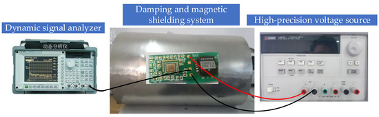 To verify the analysis presented in the previous sections, the interface circuit chip was designed in a standard 0.35 μm CMOS process. The printed circuit board (PCB) photograph of a microaccelerometer is shown in Figure 10. The interface circuit chip, which had 40 PAD pins for the chip test, is also shown in Figure 10. The pins on the interface ASIC chip were connected with silicon aluminum wire by a welding machine. The active area of the chip was 3.2 mm × 3 mm. We verified the function of the interface circuit before testing the performance of the microaccelerometer. The 5 V power supply was supported by Agilent E3631 (Agilent Technologies Inc., Santa Clara, CA, USA). The Agilent 35670A spectrum analyzer (Agilent Technologies Inc., Santa Clara, CA, USA) was used for the noise test of the interface circuit. The microaccelerometer measurement system is shown in Figure 11. The accelerometer was placed in an environment of shock absorption and magnetic shielding.