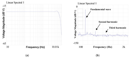 The frequency response and noise spectrum testing of the closed-loop microaccelerometer are shown in Figure 12. The low-frequency environment vibrations were still visible through a simple mass spring shock absorption system. A simple electromagnetic shielding was used to reduce the line-frequency harmonics. The power dissipation of the interface circuit chip was 7.7 mW at a sampling frequency of 10 kHz. We set the frequency to be much higher than the Nyquist sampling rate, which can prevent noise aliasing.