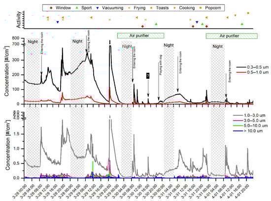 In the first campaign (28 March 12:00 a.m.–1 April 11:59 p.m.), measurements were performed in the living room (21 m2) which was nearly permanently occupied, from 8:00 a.m. to 1:00 a.m. (about 16–17 h per day), by up to four persons. Most of the activities were related to remote work and school duties performed by the children. The kitchen (8 m2) was directly connected to the living room; thus, all meal production activities had a pronounced impact on air quality. Two air monitors based on light scattering were employed for the measurements: an AeroTrak8220 (TSI INC., Shoreview, MN, USA) and an OPC-N3 (AlphaSense Ltd., Great Notley, UK). The first was used as a reference instrument. The AeroTrak 8220 and OPC-N3 were placed about 60 cm above floor level, which corresponded to the head level of a person sitting on a sofa. The inlets of the devices were placed about 15 cm from each other to collect air from a similar area. The measurement data were recorded in the AeroTrak8220 internal memory, while the OPC-N3 was connected to the computer running the manufacturer’s software (Version OPC 1.0.6457.18465), allowing data visualization and recording in a CSV file. The activities such as “window”, “cooking/frying/toast/popcorn”, “vacuuming”, and “sport” were manually noted and then plotted on the graph as corresponding single marks on a timeline. The time of the activity beginning was noted.