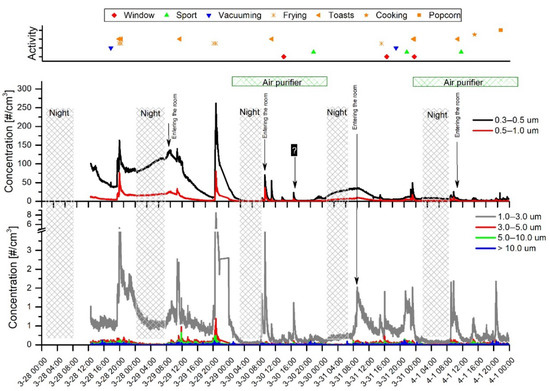 The experimental data clearly demonstrated that meal preparation such as frying, making toast, and popcorn microwaving belonged to the major particle sources which produced peak concentrations up to 882 and 350 #/cm3 when measured with the AeroTrak 8820 and OPC-N3, respectively. During frying, the PN concentration rose rapidly within a few minutes, while the decay to the background concentration was prolonged up to 4–8 h. The highest increases related to frying were observed for particles in a range of 0.3–3 µm. Moderate PN increases were usually observed for particles >3 µm. However, on 29 March frying and toast-making resulted in a distinctly elevated concentration of particles >3 µm. One can conclude that the appearance of coarse particles was observed during high-intensity frying. While boiling is a long-term process compared to frying, it was not identified as a significant activity increasing indoor air PN and PM concentrations. Particle emissions during soup boiling (1 April about 2:00 p.m.) were some of the lowest identified among other activities. A slight increase in the number of particles sized 0.3–0.5 µm and a more distinct peak of 1.0–3.0 µm particles were observed.
