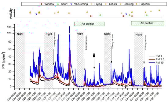 The PM concentration records obtained with the OPC-N3 are presented in Figure 4. The peak values observed during various activities are consistent with the PN readings presented in Figure 2 and Figure 3. However, some activities such as exercise and vacuuming were more distinctly reflected when PM10 records were considered. This shows that larger particles have pronounced input in mass concentration. They appear in the air due to resuspension when mechanical forces and air agitation occur [18,52].