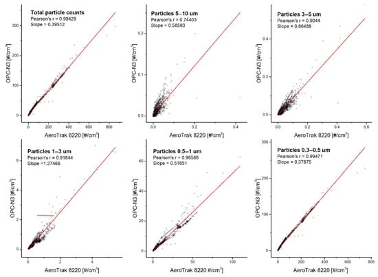 At the same time and under identical ambient conditions, the PN concentration time series reported by the AeroTrak8220 and OPC-N3 displayed a similar pattern. However, the AlphaSense monitor appeared to underestimate the total particle concentration readings. The mean PN concentrations of all detected particles during the experimental period was 95.52 ± 114.10 #/cm3 and 37.68 ± 46.29 #/cm3 for the AeroTrak8220 and OPC-N3, respectively. The lower counting efficiency of the previous AlphaSense model (OPC-N2), especially in low particle concentrations, was previously reported [28,55]. One of the reasons contributing to the underestimation of the results concerns the 50% efficiency of counting particles of 0.3 µm diameter [51]. Figure 5 shows the correlations of both the AeroTrak8220 and the OPC-N3 readings with respect to the fitted bin classification. The slopes of the linear regression obtained in most cases were within the range 0.38–0.86, indicating that the OPC-N3 underestimates the PN concentration compared to the AeroTrak8220. The only exception was observed for 1–3 µm particles, whose correlation slope was 1.27, demonstrating that the OPC-N3 slightly overestimates the particle counts in this range.