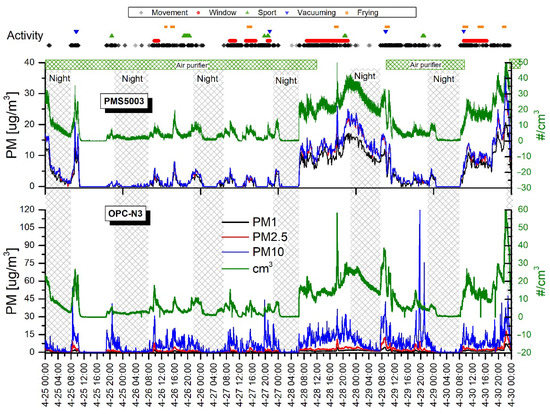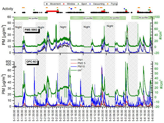 Figure 6 and Figure 7 show the time series of PM concentrations and the total particle counts recorded with two sensors, the OPC-N3 and PMS5003 (Plantower), from 25 April–5 May. The shadowed vertical nighttime areas represent roughly the hours corresponding to the main room’s occupants’ sleep time. The upper part of the graphs shows time-correlated activities that potentially have an impact on PM levels.