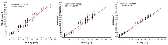 Figure 8 shows PM-wise sets of PM1–PM2.5, PM1–PM10, and PM2.5–PM10 readings obtained with the PMS5003 sensor. A regression analysis revealed a very high correlation resulting in Pearson’s r coefficients close to one. An almost linear relationship among PM1, PM2.5, and PM10 is surprising since the indoor particle size distribution and number can vary depending on many factors such as aerosol source, motion, and outdoor concentrations. The near-linear relationship among PMs could take place only at ideal ratios of particle size and number, which would be difficult to achieve. A possible explanation of such a highly linear response is the bulk sample measurement despite individual particles. The ambient air does not directly pass a laser beam but is drawn through a sinuous channel, which does not favor measuring single particles and precisely evaluating their size.