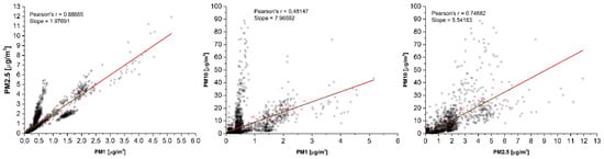 Correlation among PM readings of the AlphaSense OPC-N3 monitor. The data represent all measurements for one representative day. Similar results were obtained for the remaining single days, as well for the whole set of data.