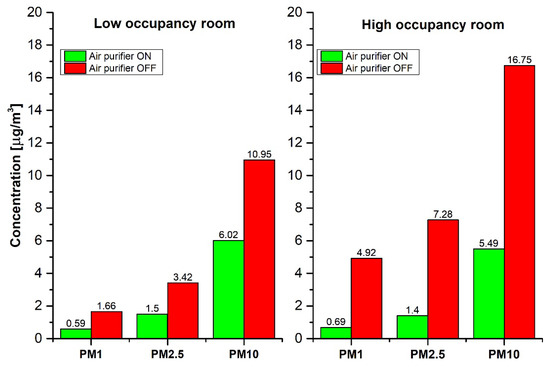 During the time the air purifier was not working, the PM1, PM2.5, and PM10 concentrations in the high-occupancy room were distinctly elevated compared to the low-occupancy room (Figure 10). This shows that the number of persons and the intensity of room usage had an impact on PM levels. In addition to the occupancy, the close vicinity of the kitchen could substantially contribute to the increased PM levels. In contrast, when the air purifier was operating, the PM concentrations in both rooms were almost the same. This was most probably due to the feedback motor control when the air purifier’s integrated dust sensor detected increased aerosol levels.