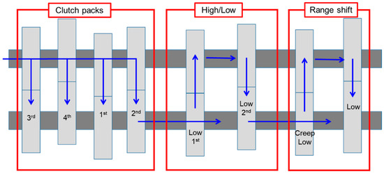 The powertrain of the PST model used in this study was composed of 4 clutch packs, high/low, and range shift. The schematic diagram of the powertrain of the PST is shown in Figure 1. In this study, the PST has been configured with 16 × 16 for both the forward and reverse gear stages. The engine power is delivered through clutch packs dealing with high/low by decreasing or increasing speed, and range shift to the driving axle. The range shift helps to perform various agricultural works based on load levels. The block diagram of the PST configuration is shown in Figure 2. It is observed that the clutch packs are the key component of the transmission. The clutch packs make the connection between the shaft from the engine and the shaft which turns the driving wheels. The clutch packs allow the vehicles to change speed and stop completely without turning off the engine. To stop the vehicle, the connection between the engine and the driving wheels need to break temporarily that is performed by the clutch packs. Each clutch pack of the PST is performed by the hydraulic pressure, which is supplied from the individual proportional valve. Therefore, the design of the clutch pack for the PST of the agricultural tractor is the main concern in this study.