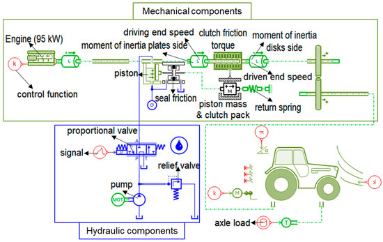 The PST which is composed of main driving shift (4 clutch packs), 2 high-low clutch, and 2 stages of range shifts in the powertrain, is the entire PST model (Figure 2). This study is focused on the determination of design factors and variables for the PST clutch packs. Also, the clutch packs and high-low clutches which consist of several mechanical components, are the same structure. Therefore, the simulation model was simplified to determine the design factors and variables for the PST clutch pack, which is shown in Figure 4. The clutch pack is operated by the hydraulic pressure and the hydraulic pressure regulates the clutch engagement by the proportional valve. To be characterized by real machinery, the axle load and tractor specifications were applied in the tractor model. The axle load was estimated using the traction prediction model [46,47].