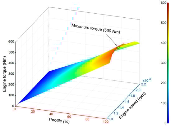 The engine torque was calculated at each throttle (%) using Equation (12), which was applied to develop the static engine map used in this study is shown in Figure 5, whereas the maximum torque was 560 Nm at 1400 rpm for 33.33% of throttle opening. The simulation was conducted using the developed engine map.