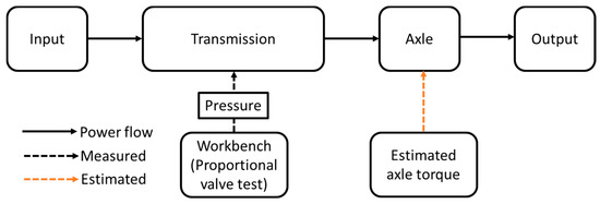 The schematic diagram of the simulation procedure was shown in Figure 6. The supplied pressure of the proportional valve, which is considered as equal to the engagement pressure because the supplied pressure at port A of the proportional valve acts on the piston to engage the clutch. Therefore, a test bench was constructed to measure the supplied pressure at port A of the proportional valve and applied to the simulation model. The proportional valve pressure was measured based on the different temperatures of the hydraulic oils. The estimated axle load was also applied to the tractor model. The simulation parameters such as the sliding friction coefficients were calibrated using the measured proportional valve pressures. The clutch pack design condition was set 1.20 s as the maximum engagement time for PST in this study [38].