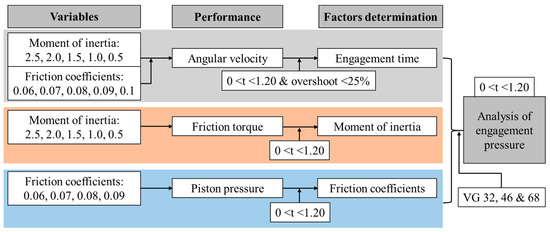 The overall simulation process of this study was shown in Figure 7. First, the shifting time was determined for various levels of moment of inertia and friction coefficients on the basis of angular velocity. The designed engagement time was selected 0 < t ≤ 1.20 s. Second, the moment of inertia was determined by performing the clutch friction torque. Third, the piston pressures were performed based on various levels of the friction coefficients and the clutch engagement time. Finally, the engagement pressures of the clutch were performed to verify the selected engagement time, moment of inertia, and friction coefficients with respect to the measured proportional valve pressure, estimated axle torque, and real tractor specifications. The clutch engagement pressures were analyzed at various temperature levels for three hydraulic oils (VG 32, 46, and 68).