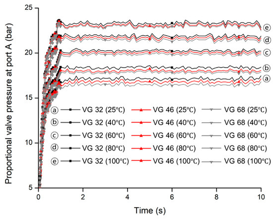 The proportional valve pressures at port A were measured for three hydraulic oils (VG 32, VG 46, and VG 68), which is shown in Figure 10. (a), (b), (c), (d), and (e) are five temperature levels (25, 40, 60, 80, and 100 °C) for three hydraulic oils (VG 32, VG 46, and VG 68). At each temperature level, the pressure was similar trend and maximum pressure was almost the same for all hydraulic oils. It was observed that the maximum pressure has big differences among the temperature levels. It was noticed that the proportional valve pressure increased gradually and became steady within 1.2 s for all hydraulic oils.