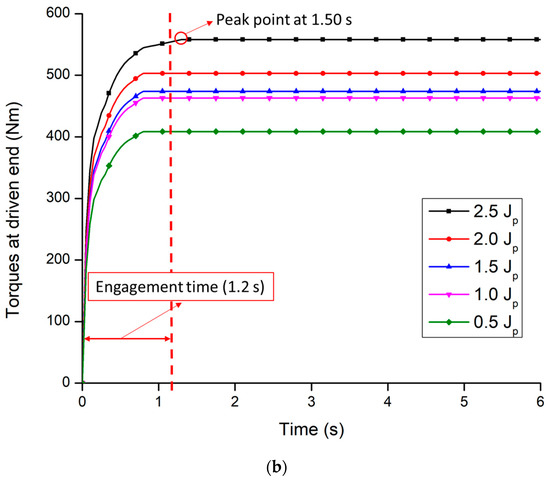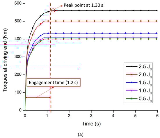 The torque of both driving and driven end influence by the moment of inertia because the moment of inertia is highly affected by the heat generated in the friction plate during clutch engagement. Figure 12a,b shows the torques of the clutch at a different moment of inertia for both driving and driven end. It was observed that the torques of the clutch for both ends were directly proportional to the moment of inertia. However, the maximum torque was also found between the designed engagement time at the moment of inertia (Jd) less than or equal 2 kg·m2, which accounts for a range of 0.95 to 1.02 s for driving end. It was noticed that the time of maximum torque was slightly higher than the design conditions 1.2 s when the moment of inertia was over 2 kg·m2. The time to be stable the driving end torque was 1.30 s at the moment of inertia of 2.5 kg·m2, which is shown in Figure 12a. In the case of the driven end (Figure 12b), the time of maximum torque, which was found over the design value, was 1.50 s when the moment of inertia was over 2 kg·m2. However, the times of maximum torques were below the 1.20 s (range: 0.93 to 0.98 s), when the moment of inertia was less than or equal 2 kg·m2.