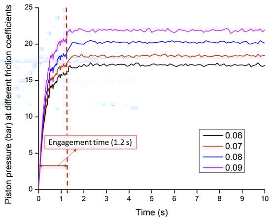 The clutch engagement pressures is directly proportional to friction coefficients (). The range of the friction coefficient was selected from 0.06 to 0.09 according to the friction plates used in this study. Yan [54] also applied the friction coefficient range of 0.05 to 0.09 for the simulation model of synchronizer’s friction pair for transmission.