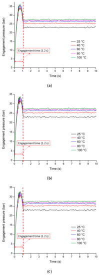 The engagement pressures are influenced by the heat generated in the friction plates during the engagement. The hydraulic oils (VG 32, VG 46, and VG 68) at the different temperatures were selected to verify the designed factors. To analyze the engagement pressure, the selected sliding friction coefficient (0.09), moment of inertia (2 kg·m2), and friction coefficient of both driving and driven end (0.09) were set, and conducted the engagement pressure of VG 32, 46, and 68 at different temperatures of 25, 40, 60, 80, and 100 °C.