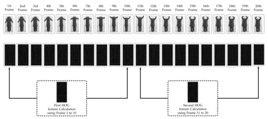 - HOG over 10 non-overlapping frames (HOGAVG10):Here, we have used HOG, which was proposed by Dalal and Trigg [31] in 2005 and is still a highly effective human detection feature. The segmented object is converted to a fixed size (e.g., 128 × 64). HOG features extracted from the resized segmented object (per frame) have a dimensionality of 3780 as explained in Figure 4. Each video has 120 frames; therefore, the final descriptor for each video having one action is 3780 × 120. Feature descriptors contain redundant data; thus, the computational cost for learning and testing is excessive. In the proposed approach, we have calculated HOG features over a window size of 10 non-overlapping frames (HOGAVG10) because the object does not change considerably over the frames as shown in Figure 5 . Thus, there is a considerable reduction in the redundant data by using 10 frames.